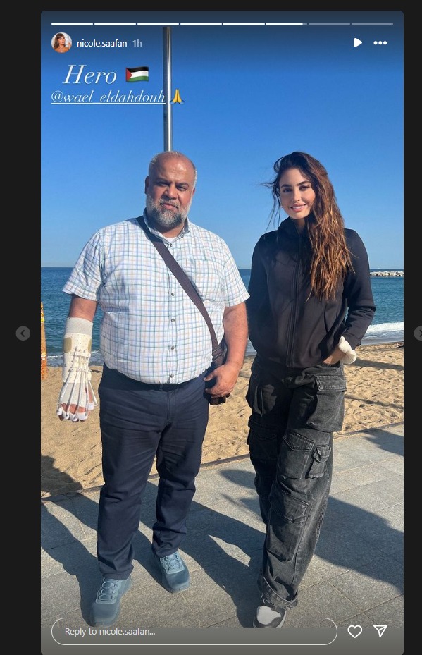 وعلقت نيكول على صورة التي جمعتها مع وائل الدحدوح بـ البطل، نظرًا لتغطيته أحداث غزة، واستشهاد عدد من أفراد أسرته جراء القصف الإسرائيلي.