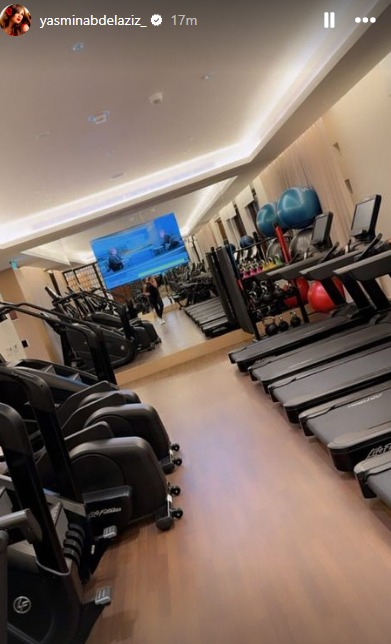 نشرت الفنانة ياسمين عبد العزيز، صورا لها عبر خاصية ستوري عبر موقع تبادل الصور والفيديوهات إنستجرام، خلال وجودها في صالة الجيم بأحد الفنادق، وذلك خلال قضائها إجازة عيد الفطر المبارك خارج البلد.