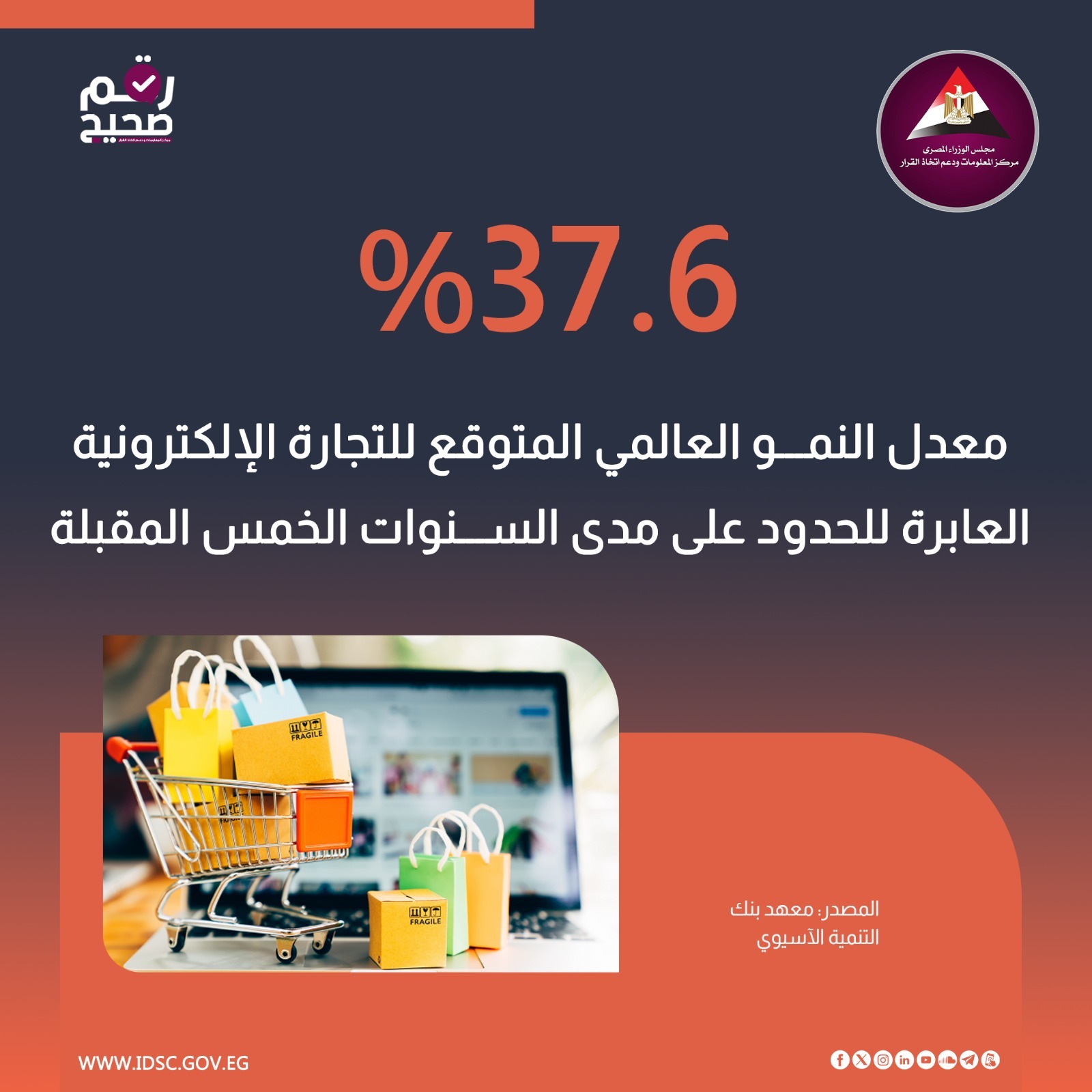 وأكد المركز الإعلامي لمجلس الوزراء، أن معدل النمو العالمي المتوقع للتجارة الإلكترونية العابرة للحدود على مدى السنوات الخمس المقبلة يصل إلى 37.6%.