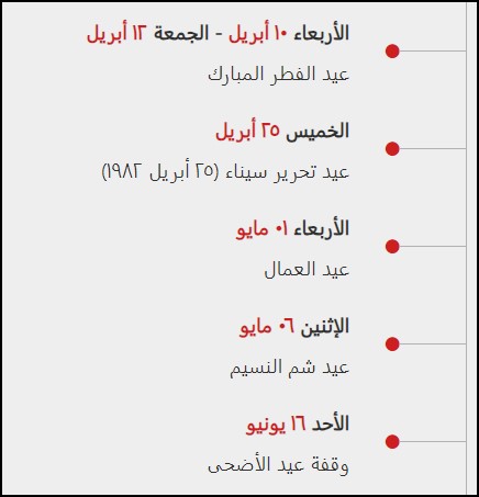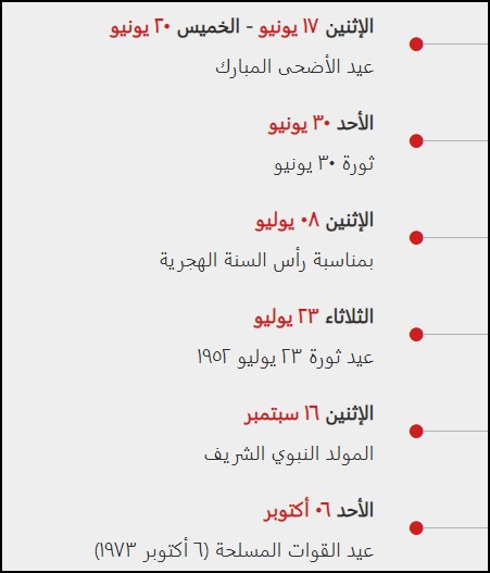 - من الأحد 16 يونيو حتى الخميس 20 يونيو: عيد الأضحى المبارك 2024