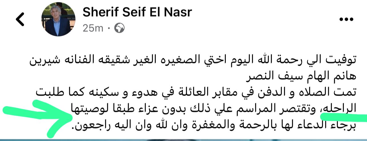 وأضاف شريف: وتقتصر المراسم على ذلك بدون عزاء طبقا لوصيتها، برجاء الدعاء لها بالرحمة والمغفرة وإن لله وإن إليه راجعون.