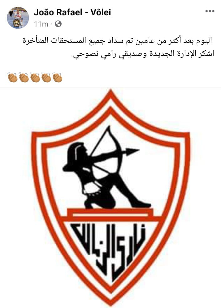 وكتب رافائيل عبر حسابه على فيس بوك: "اليوم بعد أكثر من عامين تم سداد جميع المستحقات المتأخرة أشكر الإدارة الجديدة وصديقي رامي نصوحي".