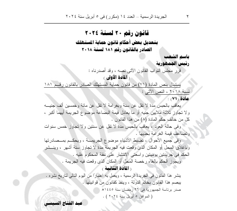 ونص القرار على: باسم الشعب ورئيس الجمهورية، قرر مجلس النواب القانون الآتي نصه، وقد أصدرناه، باستبدال المادة رقم 71 من قانون حماية المستهلك الصادر بالقانون، رقم 181 لسنة 2018، النص الآتي: