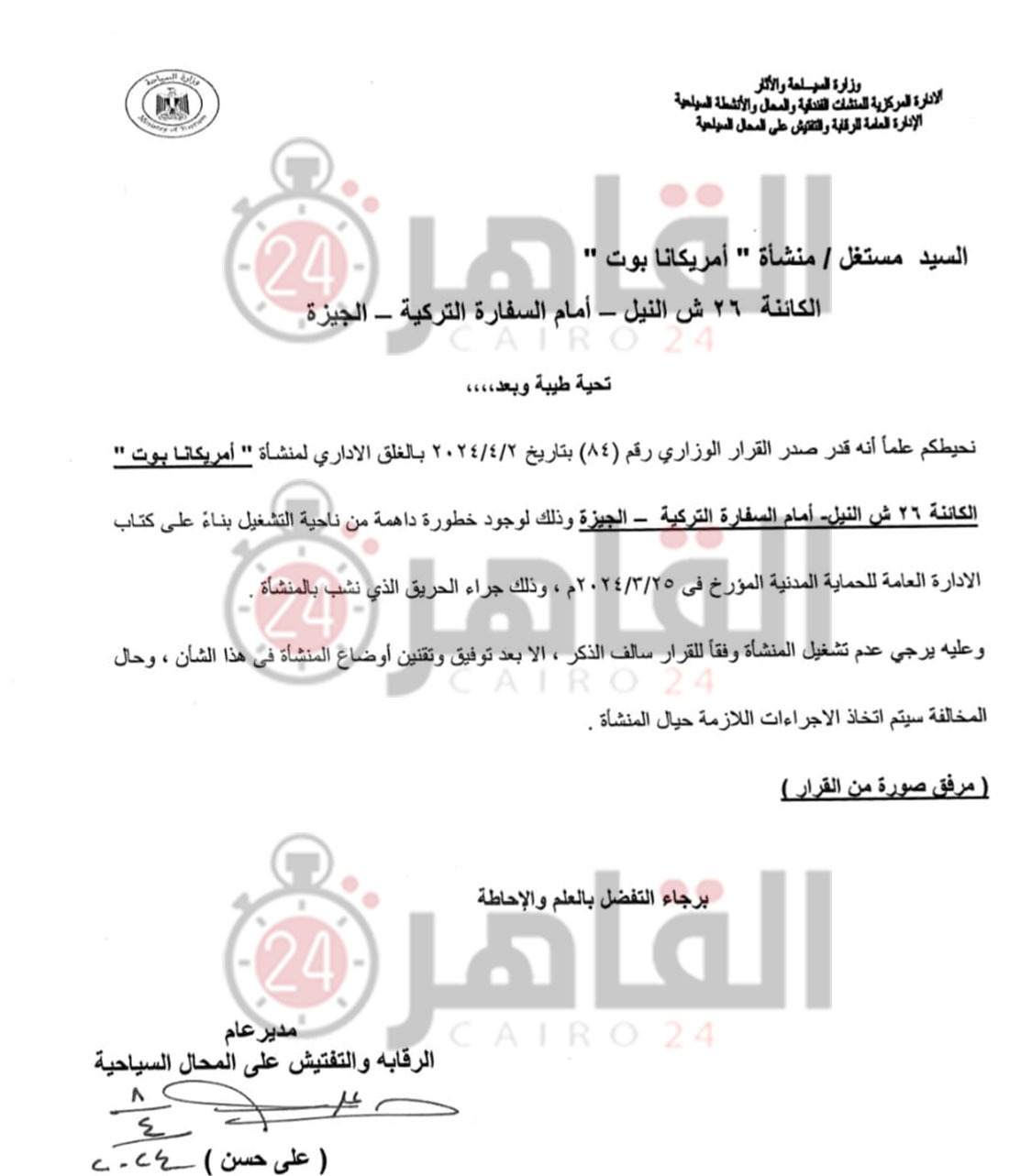 وجاء في قرار وزارة السياحة رقم 84 لسنة بتاريخ 2 / 4/ 2024 التالي: قد صدر القرار الوزاري بالغلق الإداري لمنشأة أمريكانا بوت الكائنة 26 شارع النيل بالجيزة وذلك لوجود خطورة داهمة من ناحية التشغيل بناء على كتاب الإدارة العامة للحماية المدنية المؤرخ في 25/3/2024 وذلك جراء الحريق الذي نشب بالمنشأة في هذا الشأن وحال المخالفة سيتم اتخاذ الإجراءات اللازنة حيال المنشأة.