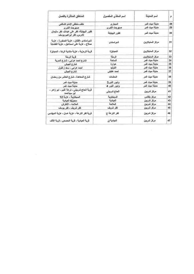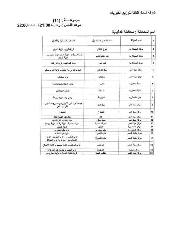 مجموعة 11: وضمت مركز السنبلاوين، ومركز ميت غمر، ومدينة المطرية، ومركز منية النصر، وسيتم فصل التيار الكهربائي من الساعة 10 إلى الساعة 11 مساءًا.