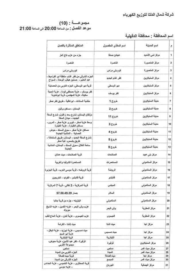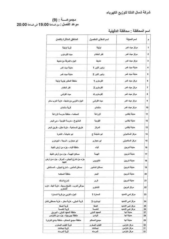 مجموعة 9: وضمت مركز ميت غمر، ومركز الستاموني، ومدينة بلقاس، ومدينة شربين، ومركز تمي الأمديد، ومركز دكرنس، ومدينة أجا، وسيتم فصل التيار الكهربائي من الساعة 8 إلى الساعة 9 مساءًا.