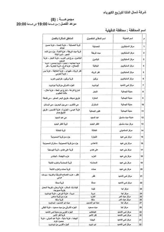 مجموعة 8: وضمت مركز السنبلاوين، ومدينة الجمالية، ومركز بني عبيد، ومركز تمي الأمديد، ومركز أجا، ومركز الستاموني، وسيتم فصل التيار الكهربائي من الساعة 7 إلى الساعة 8 مساءًا.