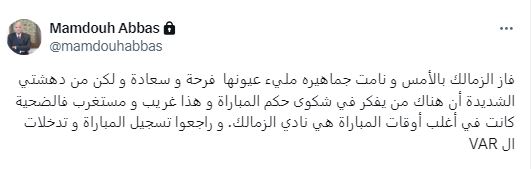 وأضاف ممدوح عباس في تغريدته قائلا: ولكن من دهشتي الشديدة أن هناك من يفكر في شكوى حكم المباراة وهذا غريب ومستغرب فالضحية كانت في أغلب أوقات المباراة هي نادي الزمالك. وراجعوا تسجيل المباراة وتدخلات الـ VAR.