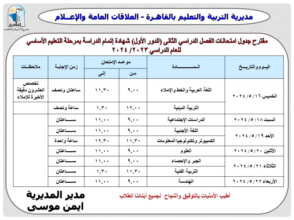 ننشر جدول امتحانات الشهادة الإعدادية 2024 الترم الثاني بالقاهرة
