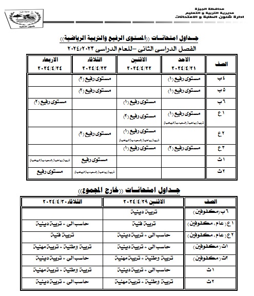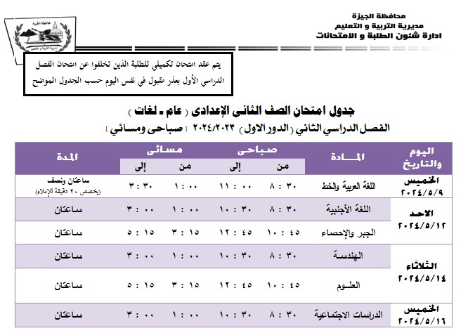 جداول امتحانات طلاب النقل والشهادة الإعدادية بالجيزة الترم الثاني
