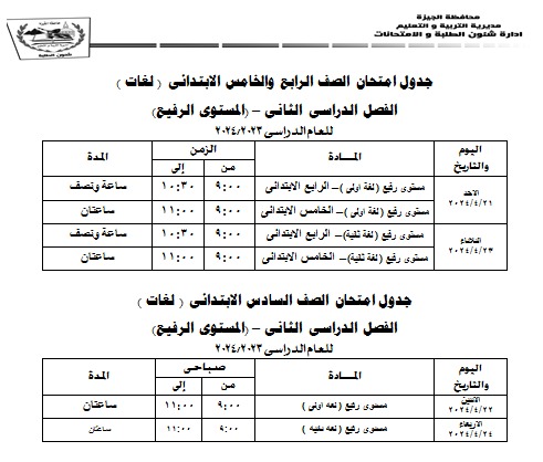 وأوضحت مديرية التربية والتعليم بالجيزة أن الامتحانات الخارج المجموع ومادة المستوى الرفيع لمدارس اللغات والتربية الرياضية لمدرسة السعيدية الرياضية تبدأ يوم الأحد 21 أبريل حتى يوم الأربعاء 24 أبريل 2024، امتحانات مواد خارج المجموع تبدأ يوم الاثنين 29 أبريل حتى الثلاثاء 30 أبريل 2024.