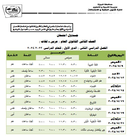 - الصف الثاني الثانوي العام يبدأ من الخميس 9 مايو 2024 وحتى الخميس 23 مايو 2024.