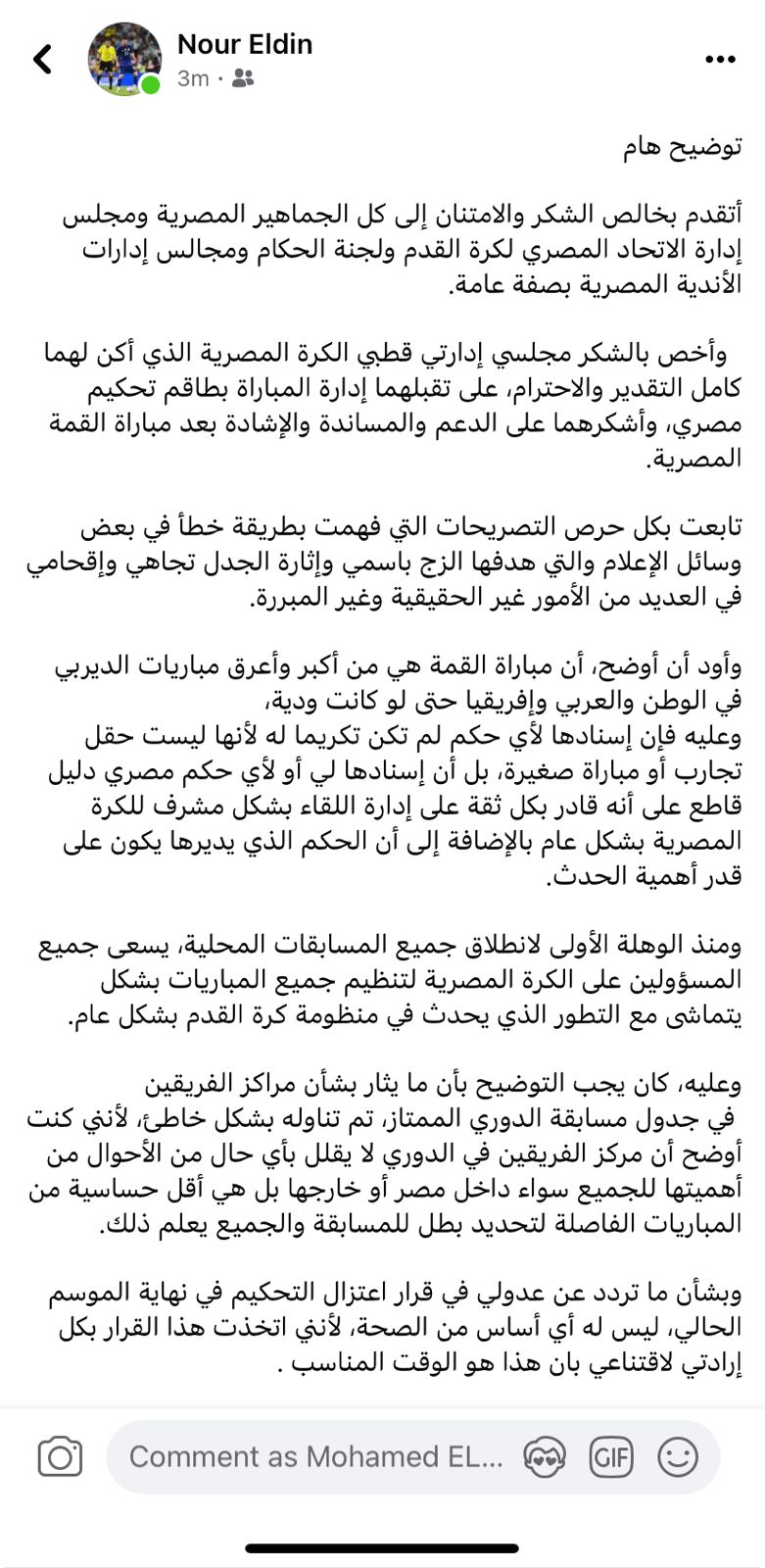 واختتم نور الدين بيانه قائلًا: وكان لزاما اختيار الطريقة اللائقة للكيان الذي نشأت فيه والذي يعد الأب الروحي لكرة القدم وهو الاتحاد المصري لكرة القدم ولجنة الحكام وإعلامهما والاتفاق ما بيننا علي الطريقه المثلى للإعلان عن قراري الخاص بالاعتزال، لأنه واجب علي ذلك، بعد تقديم رسالتي التحكيمية بكل صدق وإخلاص واحترام… والله الموفق والمستعان فيما هو قادم.. تحيا مصر.