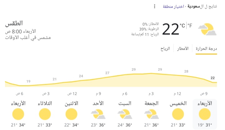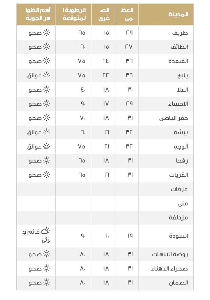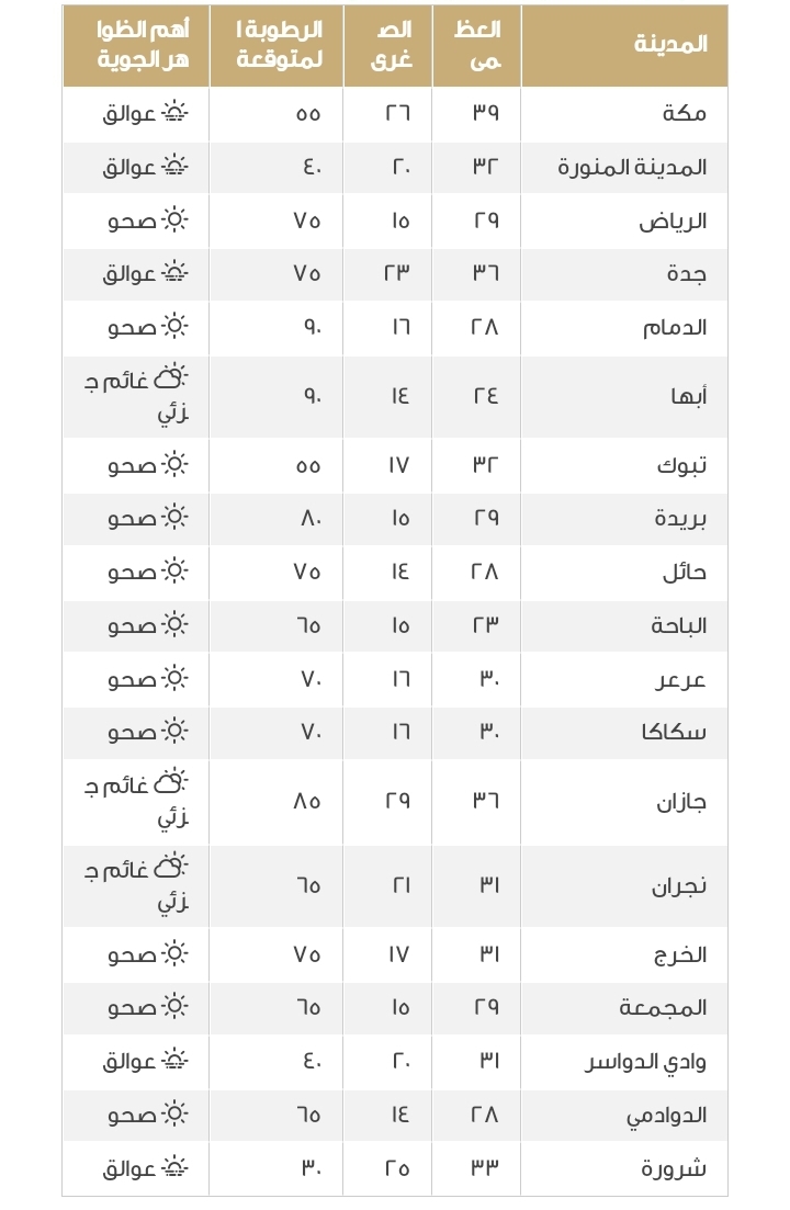 وفيما يلي بيان بـ درجات الحرارة اليوم في السعودية وأبرز الظواهر الجوية: