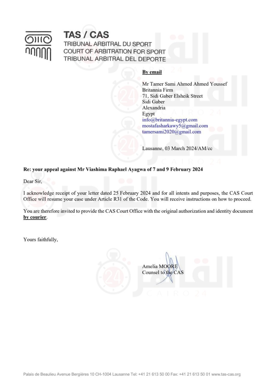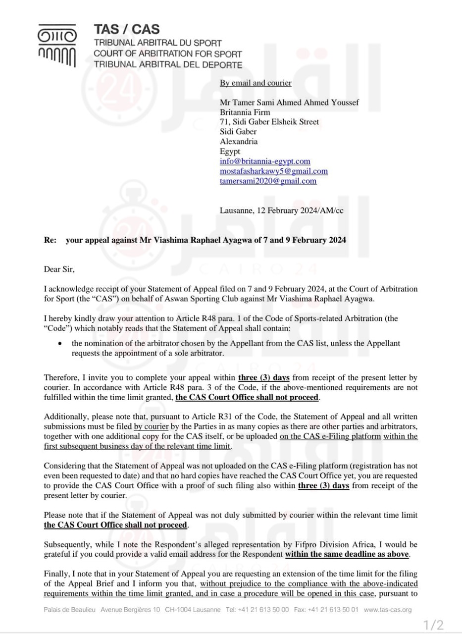 وحصل القاهرة 24 على مستند من حكم المحكمة الرياضية بخصوص قضية اللاعب النيجيري مع نادي أسوان، جاء على النحو التالي: