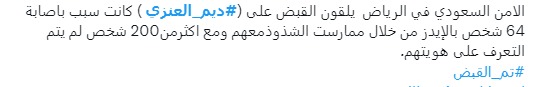 وبعد ما تصدر هاشتاج القبض على ديم العنزي، تداولت منشورات القبض عليها بين المُغردين بسرعة الصاروخ، لكن دون تأكيد أو نفي من السلطات الحكومية السعودية، وسط إشادة كبيرة من السعوديين بهذا الخبر.