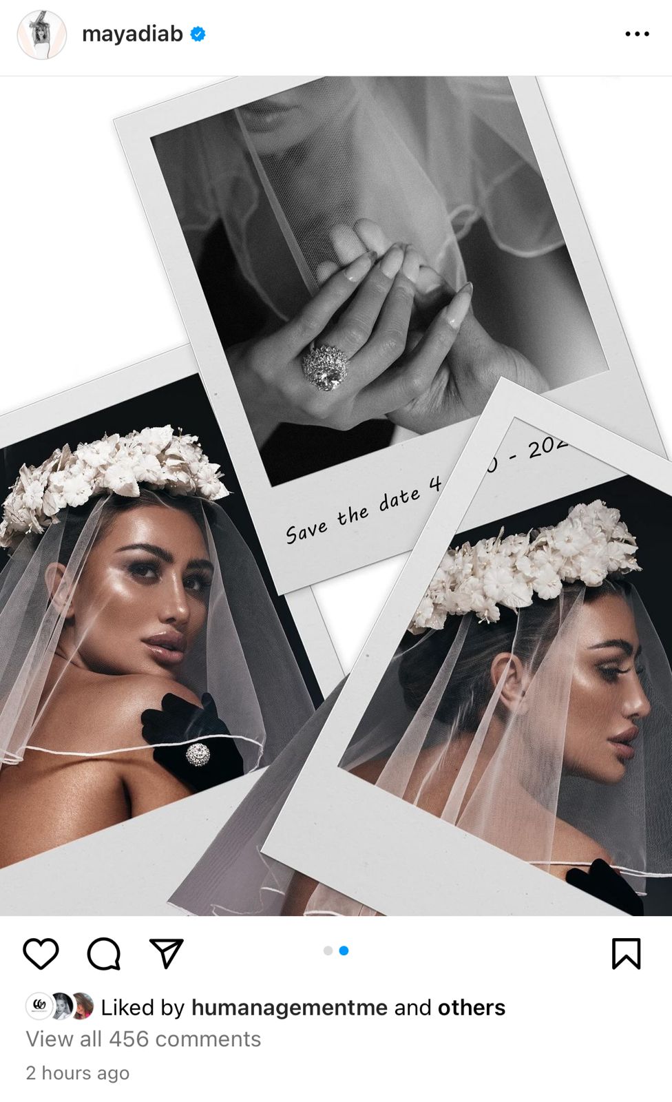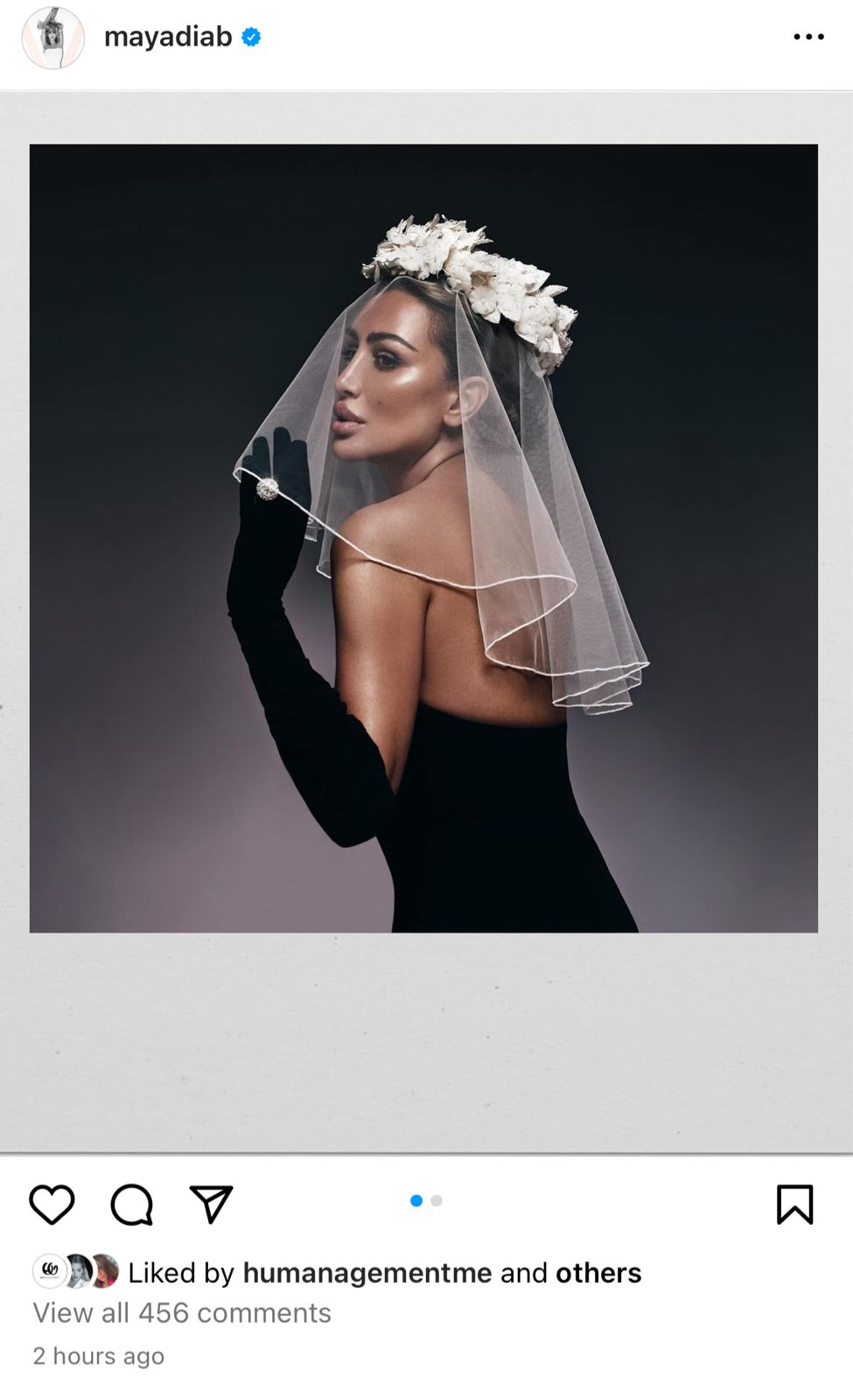ونشرت مايا دياب، صورتين لها وهي مرتدية طرحة زفاف، عبر حسابها الشخصي بموقع تبادل الصور والفيديوهات إنستجرام، دون وضعها أي تعليق خاص لها على الصور.
