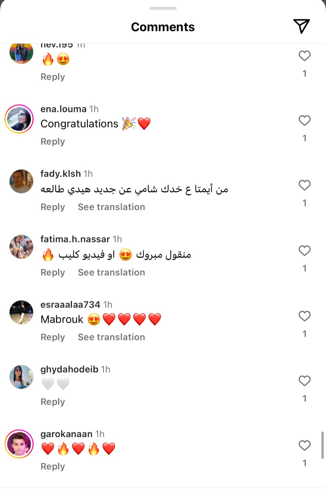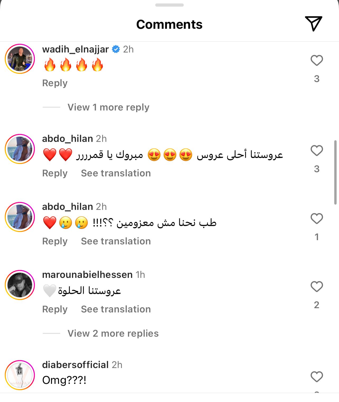 وانهالت العديد من التعليقات من قبل جمهور الفنانة مايا دياب، وجاءت التعليقات كالتالي: عروستنا الحلوة، مبروك يا حبيبتي، عروستنا أحلى عروس، نقول مبروك ولا فيديو كليب.