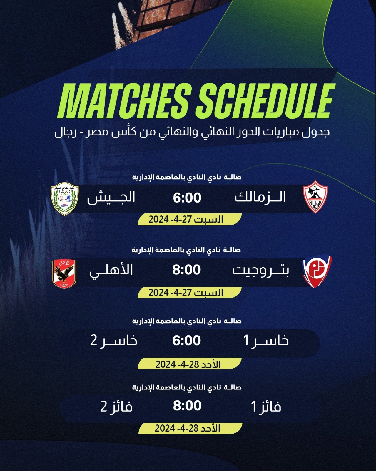 وتشارك أندية الأهلي والزمالك والجيش وبتروجيت، بالدور نصف نهائي من بطولة كأس مصر للكرة الطائرة رجال للموسم الحالي، التي تحتضنها صالة نادي النادي بالعاصمة الإدارية.