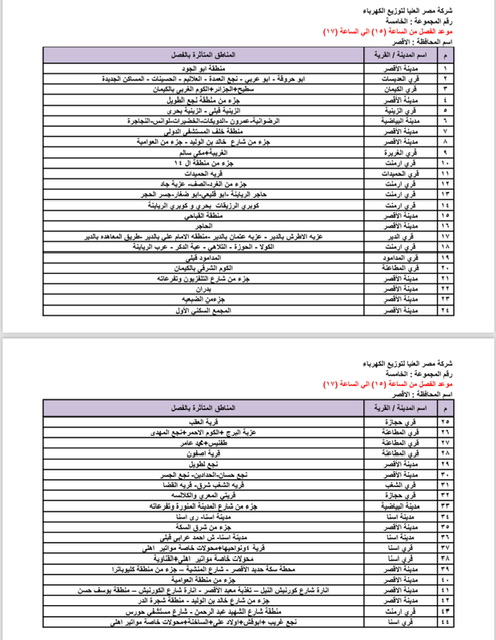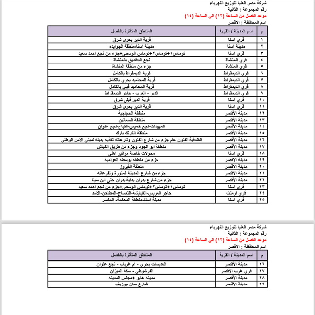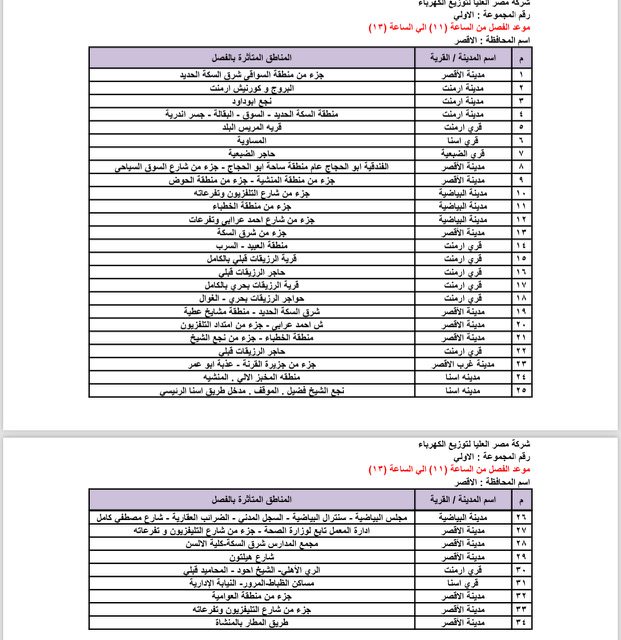 جدول تخفيف الأحمال وإنقطاع الكهرباء على مناطق الأقصر