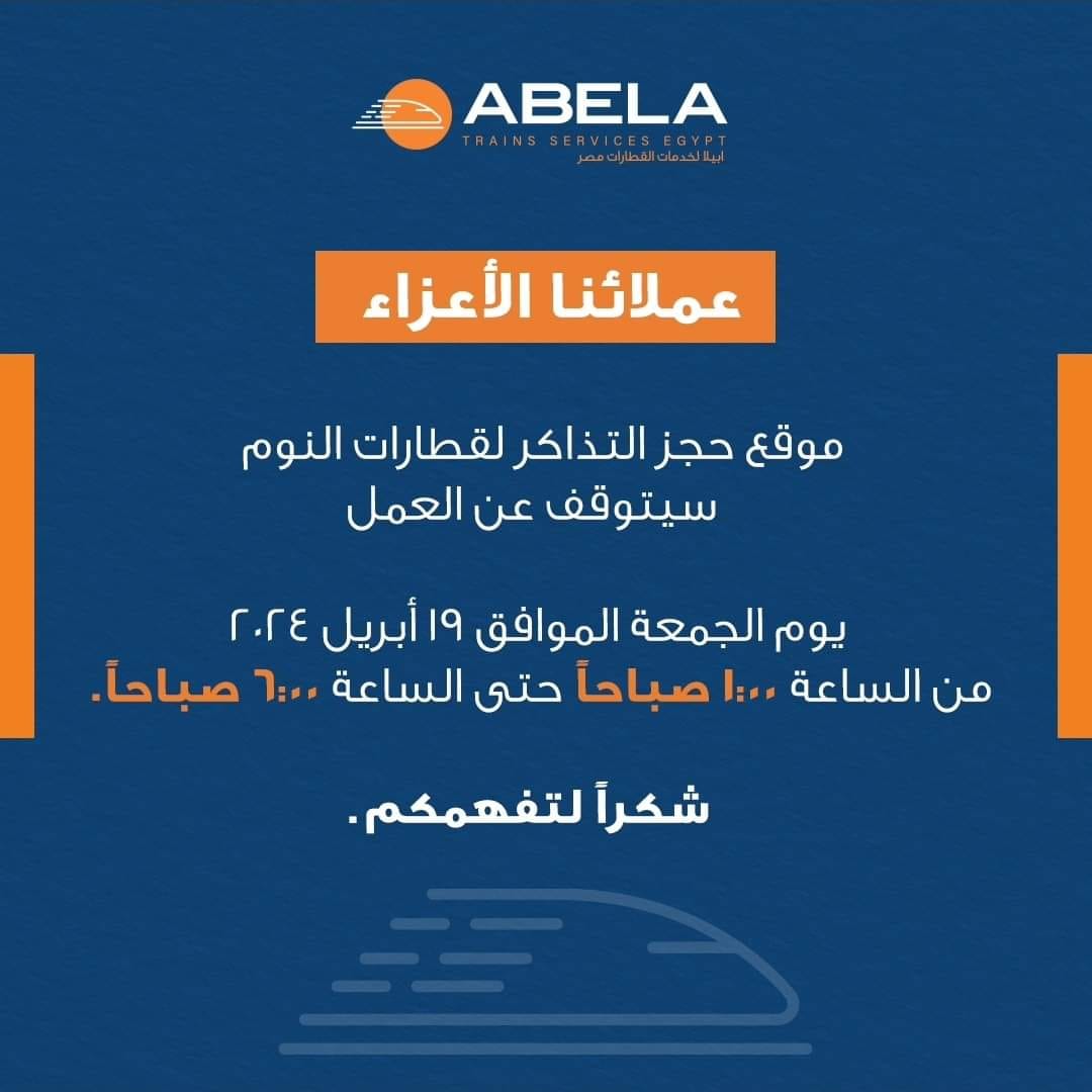 أعلنت شركة أبيلا مصر المسئولة عن إدارة وتشغيل عربات قطارات النوم، توقف تطبيق الحجز الخاص بها لمدة 5 ساعات تبدأ مساء اليوم الخميس 18 أبريل 2024، اعتبارًا من الساعة الواحدة بعد منتصف الليل، وحتى السادسة من صباح غد يوم الجمعة 19 أبريل.