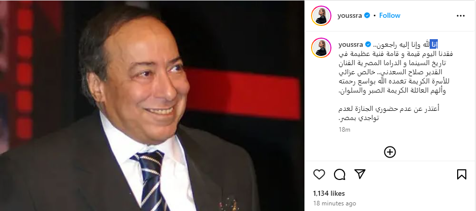 وكتبت الفنانة يسرا عبر صفحتها الرسمية على الانستجرام: إنا لله وإنا إليه راجعون.. فقدنا اليوم قيمة وقامة فنية عظيمة في تاريخ السينما والدراما المصرية الفنان القدير صلاح السعدني، خالص عزائي للأسرة الكريمة تغمده الله بواسع رحمته وألهم العائلة الكريمة الصبر والسلوان، أعتذر عن عدم حضوري الجنازة لعدم تواجدي بمصر.