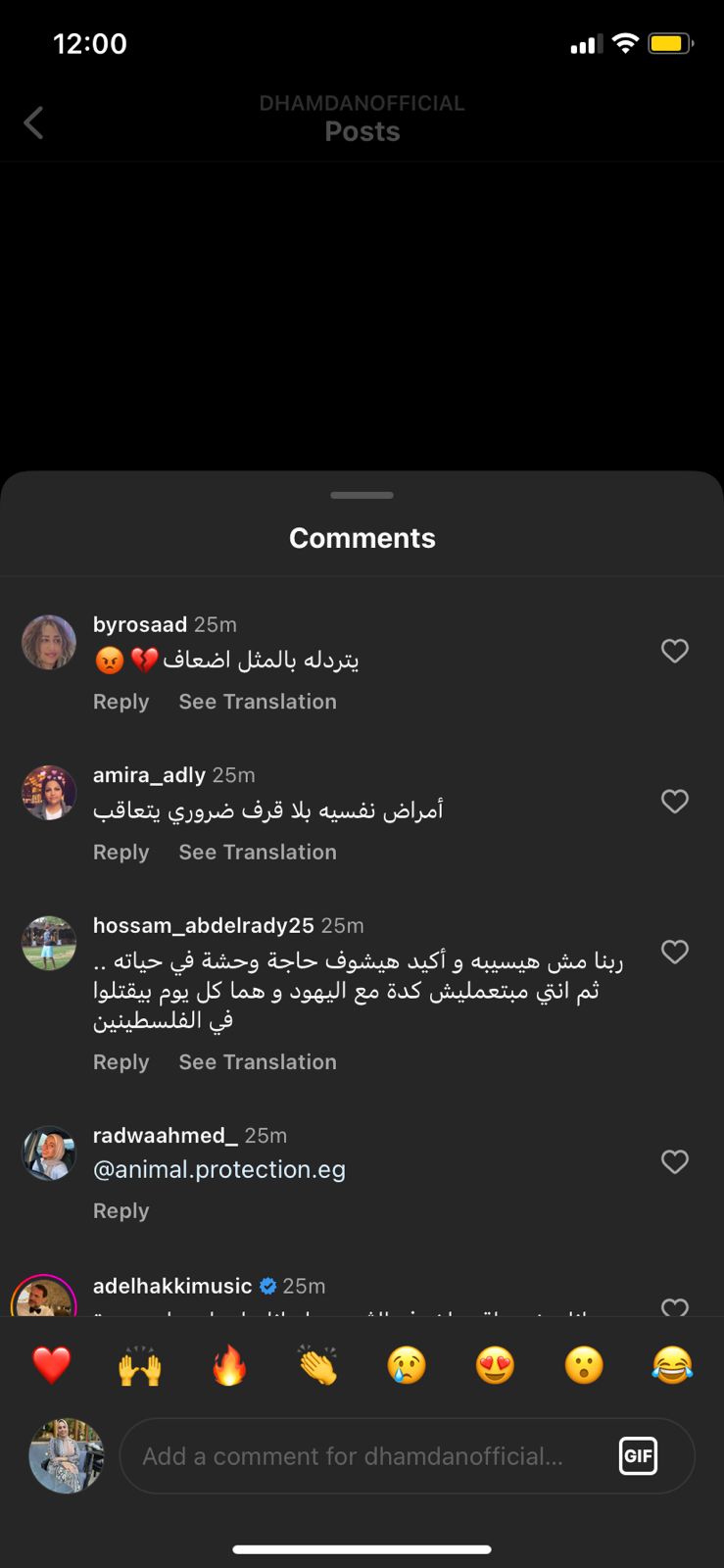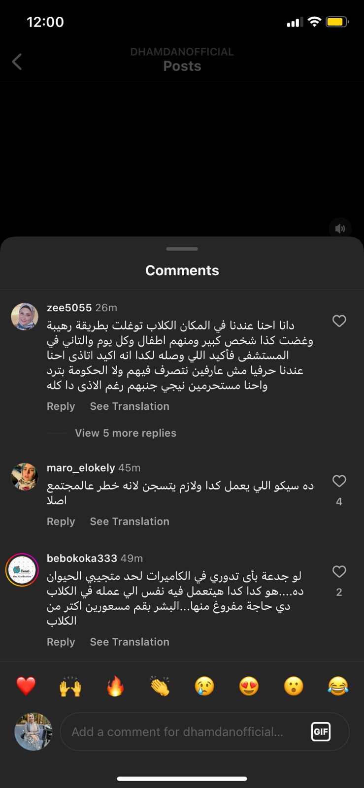 وتابعت الفنانة دانا حمدان، الكلاب دي في ست فاضلة بتأكلهم بقالها سنين ومسالمين وغلابة، ومش مسعورين ولا ليهم دعوة بحد.. ليه الأذية دي؟.. أنا مش قادرة أتخيل بشاعة وقسوة القلب دي من شاب لسه في مقتبل العمر وبقي مشروع قتال قتلة حرفيًا.. ده إحنا لسه خارجين من أيام مفترجة يا مجرم.