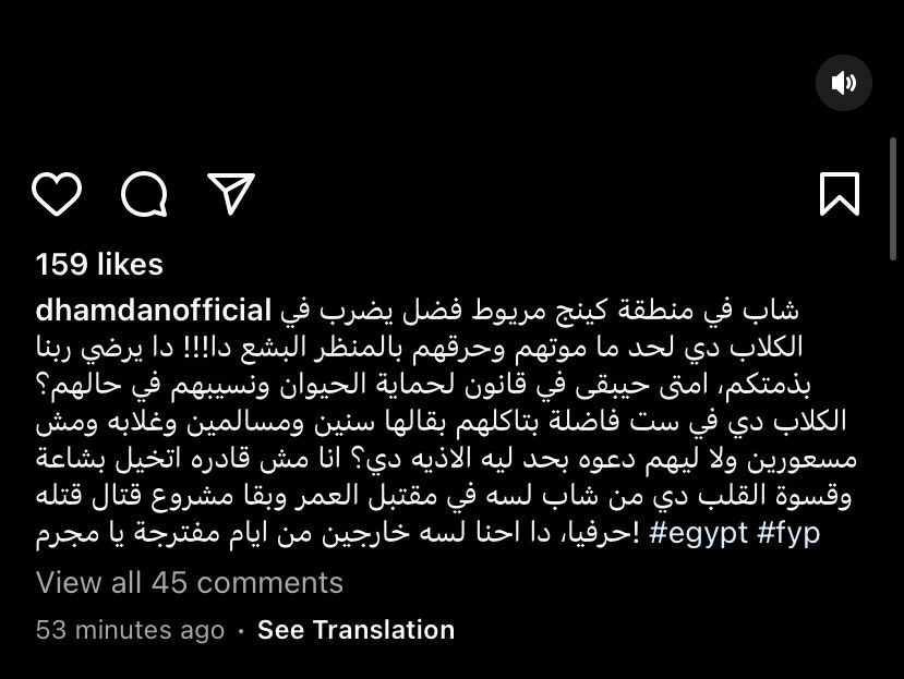 وكتبت دانا حمدان، في منشور لها، شاب في منطقة كينج مريوط فضل يضرب الكلاب دي لحد ما موتهم وحرقهم بالمنظر ده البشع ده، يرضي ربنا بذمتكم.. امتى هيبقى في قانون لحماية الحيوان ونسيبهم في حالهم؟.