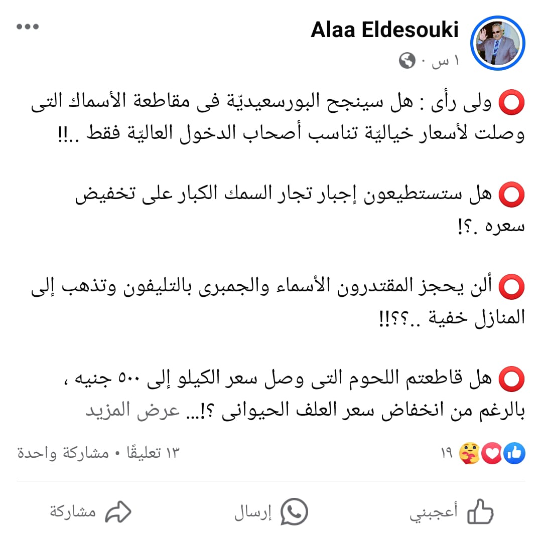 وأطلق مواطنون هشتاج #مقاطعة_شراء_الأسماك_ببورسعيد، وطالبوا الآلاف من أبناء بورسعيد بالانضمام اليهم لمواجهة جشع تجار الأسماك الذين لا يراعون البسطاء، ويبيعون الأسماك بأسعار مبالغ فيها، رغم أن المحافظة بها ساحل البحر المتوسط وقناة السويس وبحيرة المنزلة، وجميعها مصادر طبيعية للأسماك، ويجب أن تكون اسعارها مناسبة.