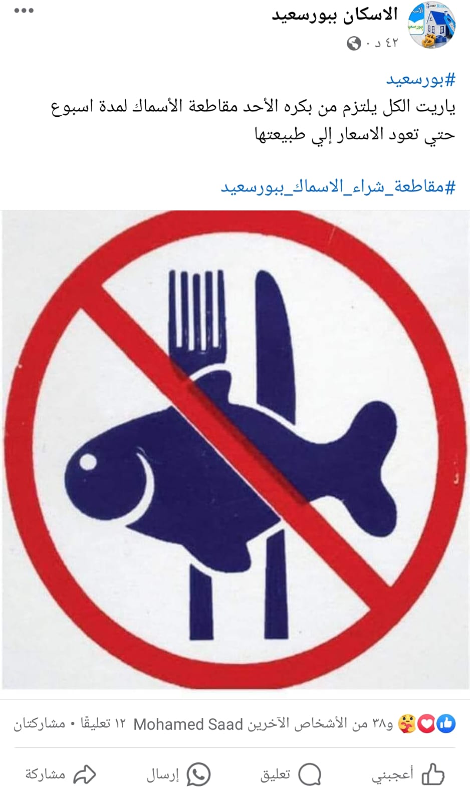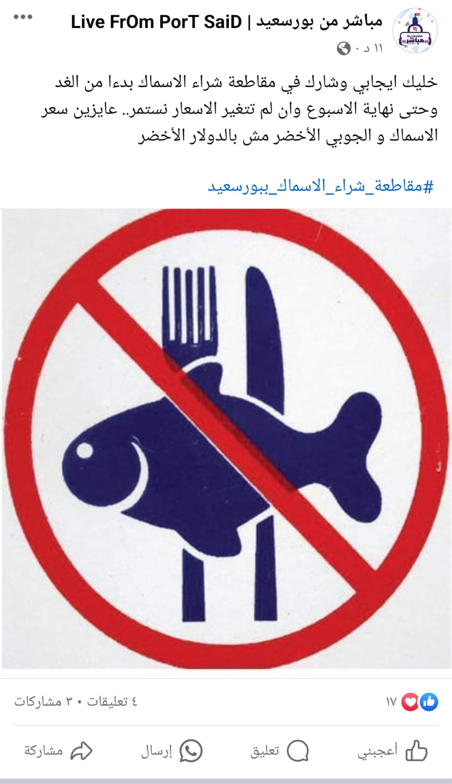 وشارك أبناء محافظة بورسعيد عبر صفحاتهم العامة ببوستات: خليك إيجابي وشارك معانا في حملة مقاطعة الأسماك، مع بعض هنقدر نواجه إرتفاع أسعار الأسماك، مش هنموت لو مكلناش سمك أسبوع، بورسعيد تقدر تخفض سعر الأسماك، كيلو السمك بـ 200 جنيه قاطعوا.
