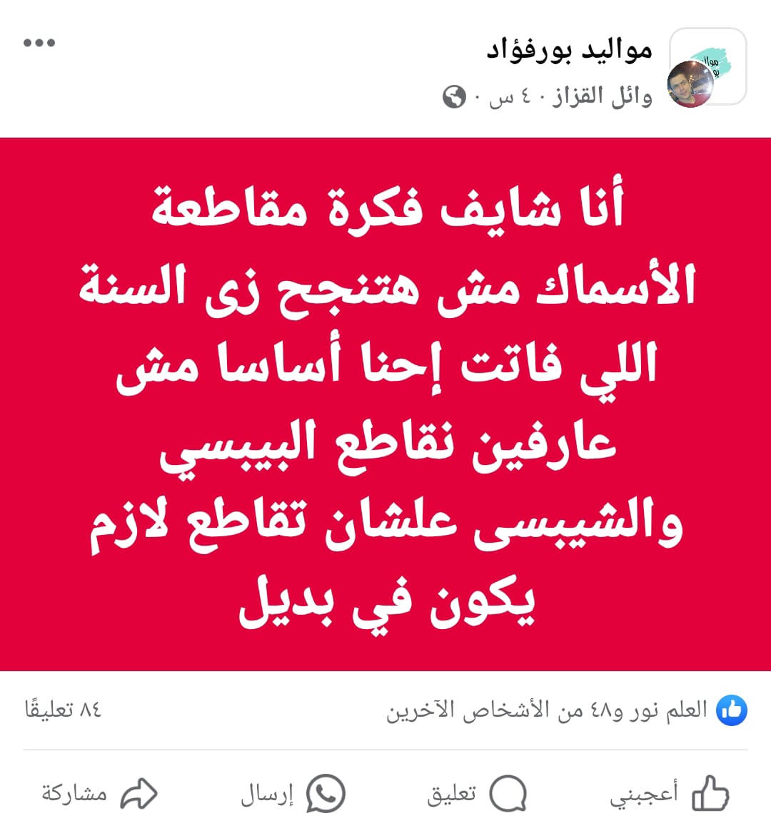 وقال وائل القزار احد مستخدموا فيس بوك: أنا شايف فكرة مقاطعة الأسماك مش هتنجح زى السنة اللي فاتت إحنا أساسا مش عارفين نقاطع البيبسي والشيبسى علشان تقاطع لازم يكون في بديل.