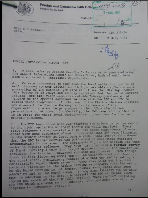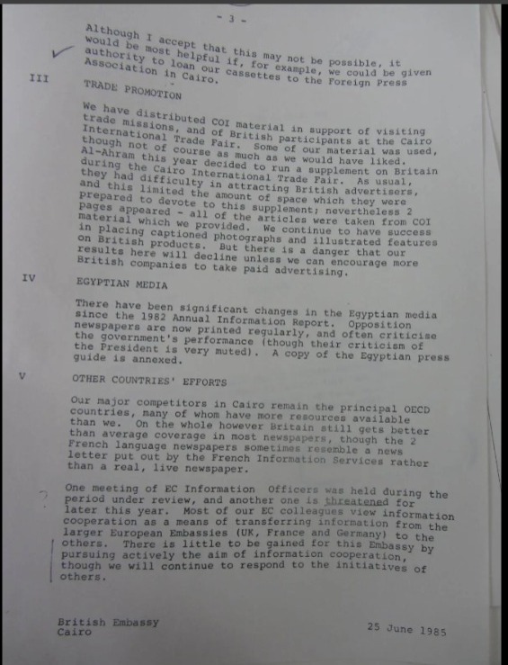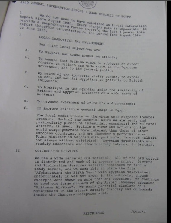 وأشارت الوثائق التي تم حجبها سابقًا بموجب قانون حرية المعلومات، وجرى نشرها من قبل موقع ميدل إيست مونيتور، إلى أنه في اجتماع بالسفارة البريطانية بالقاهرة في شهر يلويو عام 1985، أُبلغ الدبلوماسيون بأن أول أهدافهم المحلية الرئيسية هو تعزيز الجهود في مجال الترويج التجاري، وأنه بعد مراجعة نتائج عملهم عام 1984، خلص الاجتماع إلى أن وسائل الإعلام المحلية في مصر، أُبقوا عمومًا على استعداد جيد تجاه بريطانيا.