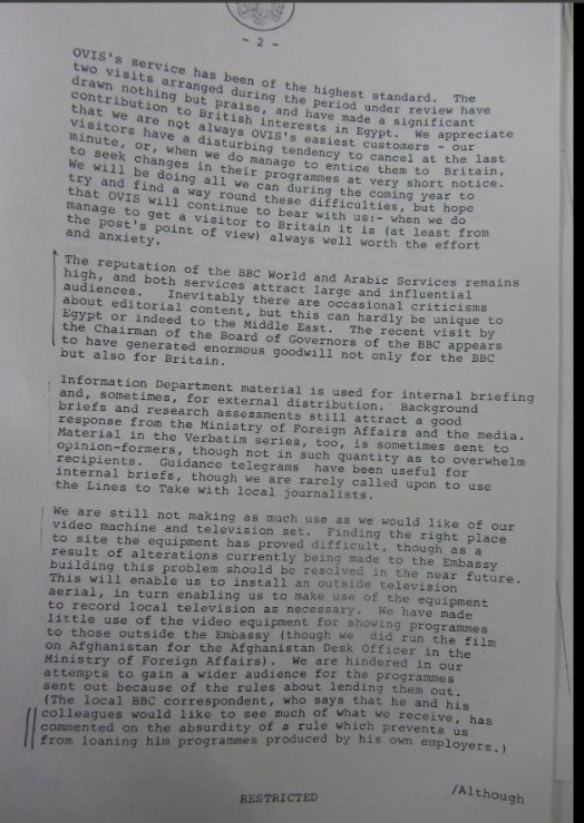 واستكمالا لما سبق، كشفت الوثائق التي أفرج عنها للنشر حسب ميدل إيست مونيتور، أن الدبلوماسيين البريطانيين في مصر كان لهم تأثير كبير على الساحة الإعلامية، إذ تمكنوا من عرض فيلم أفغانستان: السنة الخامسة، على التلفزيون المصري، وهو فيلم دعائي لتسليط الضوء على حياة الشعب الأفغاني في ظل التواجد الروسي بأفغانستان.