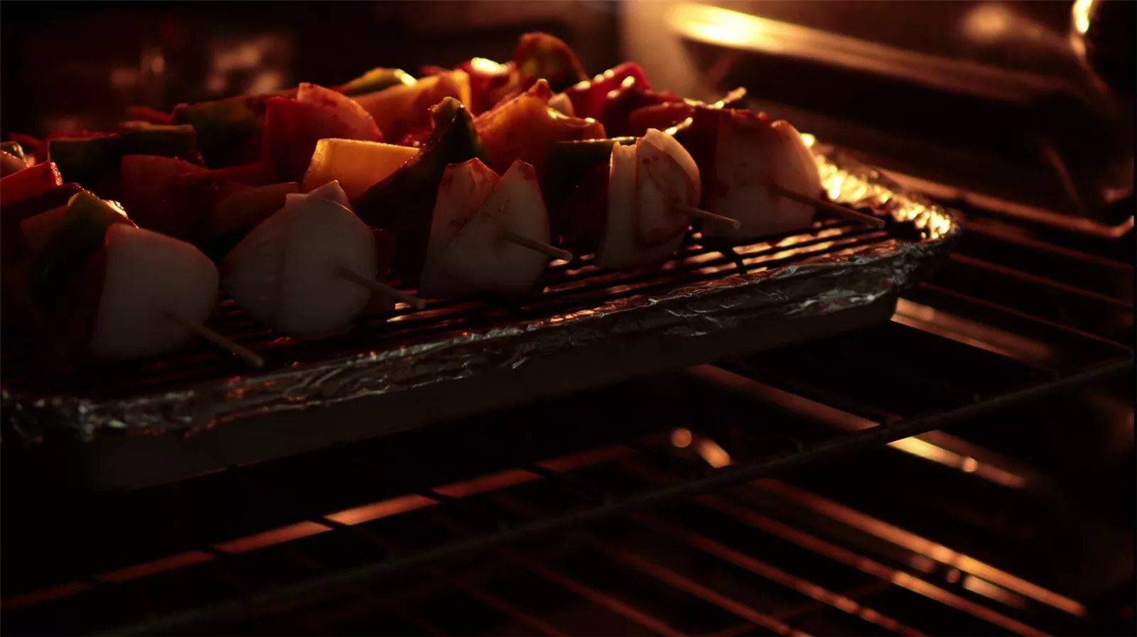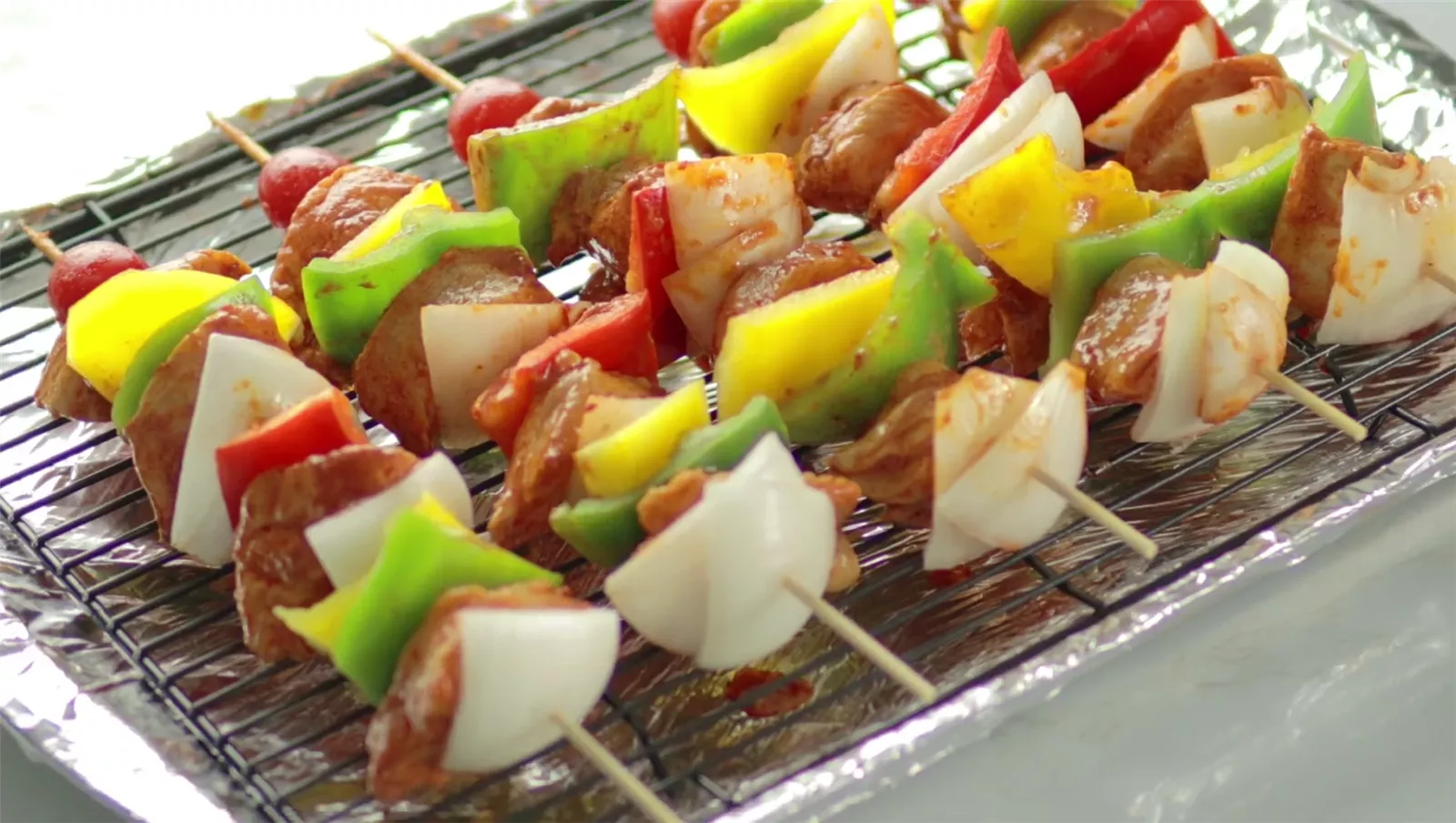 - استخدمي أسياخ الفرن المعدنية ورصّي قطع الدجاج على أسياخ الشوي بالتناوب مع شرائح الفلفل والطماطم والبصل.