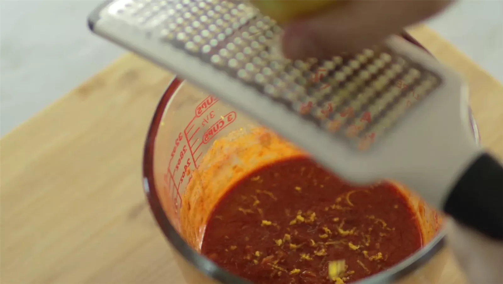 - حضري التتبيلة: في وعاء كبير، اخلطي الطماطم والفلفل والبصل وعصير الليمون والبهارات والزيت ومعجون الطماطم ومعجون الفلفل والملح والفلفل الأسود.