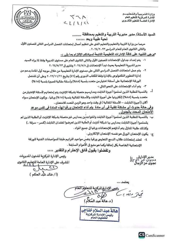 وقالت الإدارة المركزية في خطابها، إنه يرجى التنبيه على كافة الإدارات التعليمية التابعة لكم بإعداد جداول الامتحانات للصفين الأول والثاني الثانوي العام على مستوى المديرية، وفقا لما يراه مدير المديرية التعليمية بحيث تبدأ الامتحانات في 8 مايو المقبل 2024 وتنتهي يوم 23 من نفس ذات الشهر، إلى جانب يتم عمل امتحانات الفصل الدراسي الثاني على مستوى الإدارة التعليمية من خلال موجه أول المادة بدعم من إدارة التطوير التكنولوجي بالإدارة وفقا للكتاب الدوري رقم 49 بتاريخ 21 -11-2022 وعلى أن تشتمل الورقة الامتحانية على أسئلة اختيار من متعدد بنسبة 85% وأسئلة مقالية قصيرة بنسبة 15 %.