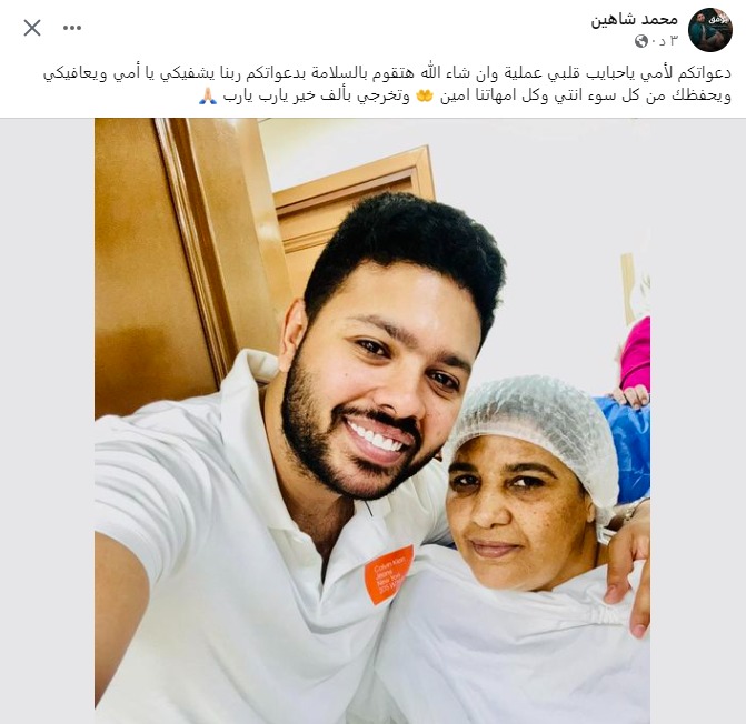 ونشر محمد شاهين صورة لوالدته، عبر حسابه الشخصي بموقع التواصل الاجتماعي فيس بوك، وعلق عليها قائلًا: دعواتكم لأمي يا حبايب قلبي، عملية وإن شاء الله هتقوم بالسلامة بدعواتكم، ربنا يشفيكي يا أمي ويعافيكي ويحفظك من كل سوء، أنتِ وكل أمهاتنا آمين، وتخرجي بألف خير يا رب.