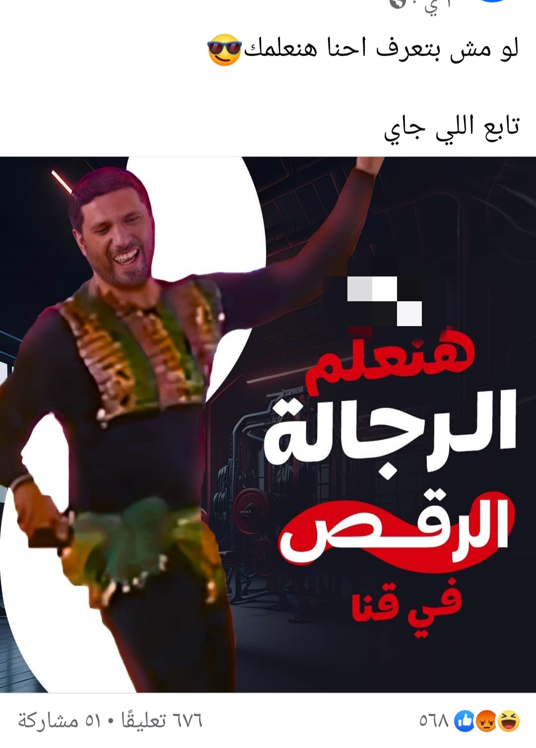 أثار إعلان أحد النوادي الرياضية _جيم_ في قنا عن دورة لتعليم الرقص للرجال، موجة غضب وجدل واسعين بين أهالي محافظة قنا على موقع التواصل الاجتماعي فيسبوك، بعدما أعلن عبر صفحته الشخصية عن تنيظم دورة لتعليم الرقص للرجال.