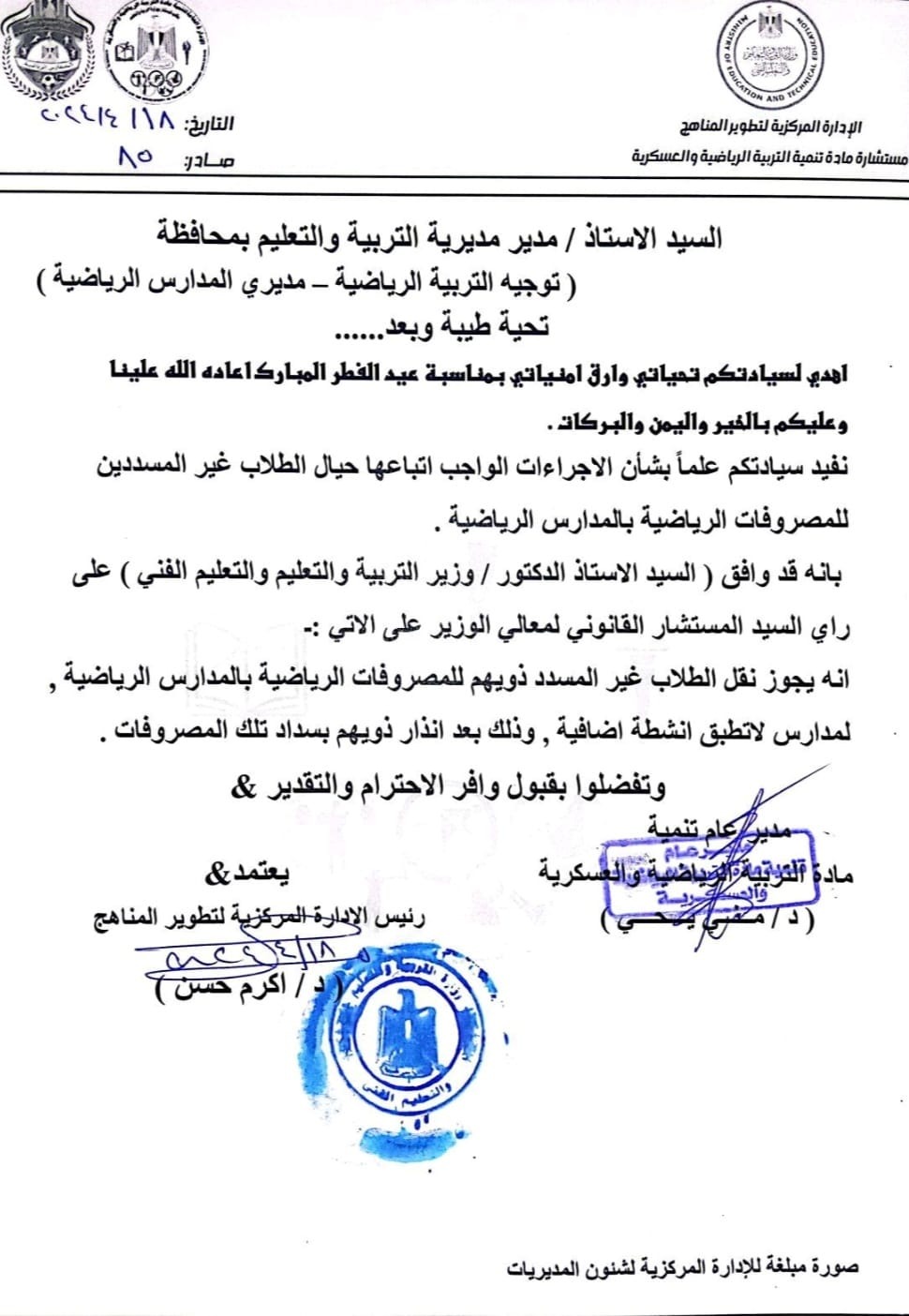 قالت وزارة التربية والتعليم والتعليم الفني، إنه بالنسبة للطلاب غير المسددين للمصروفات الرياضية في المدارس الرياضية، يجوز نقلهم لمدارس لا تطبق أنشطة إضافية وذلك بعد إنذار ذويهم بسداد تلك المصروفات.