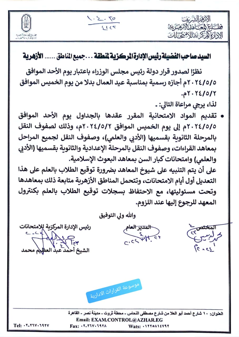 وجاء نص القرار كالتالي: نظرا لصدور قرار دولة رئيس مجلس الوزراء باعتبار يوم الأحد الموافق2024/5/5م أجازه رسمية بمناسبة عيد العمال بدلا من يوم الخميس الموافق 2\5\2024، وتقديم المواد الامتحانية المقرر عقدها بالجداول يوم الأحد الموافق 2024/5/5م إلى يوم الخميس الموافق 2024/5/2م، وذلك لصفوف النقل بالمرحلة الثانوية بقسميها الأدبي والعلمي وصفوف النقل لجميع المراحل بمعاهد القراءات، وصفوف النقل بالمرحلة الإعدادية والثانوية بقسميها الأدبي والعلمي وامتحانات كبار السن بمعاهد البعوث الإسلامية. على أن يتم التنبيه على شيوخ المعاهد بضرورة توقيع الطلاب بالعلم على هذا التعديل أول أيام الامتحانات، وتتحمل المناطق الأزهرية متابعة ذلك بمعاهدها وتحت مسئوليتها، مع الاحتفاظ بسجلات توقيع الطلاب بالعلم بكنترول المعهد للرجوع إليها عند اللزوم.