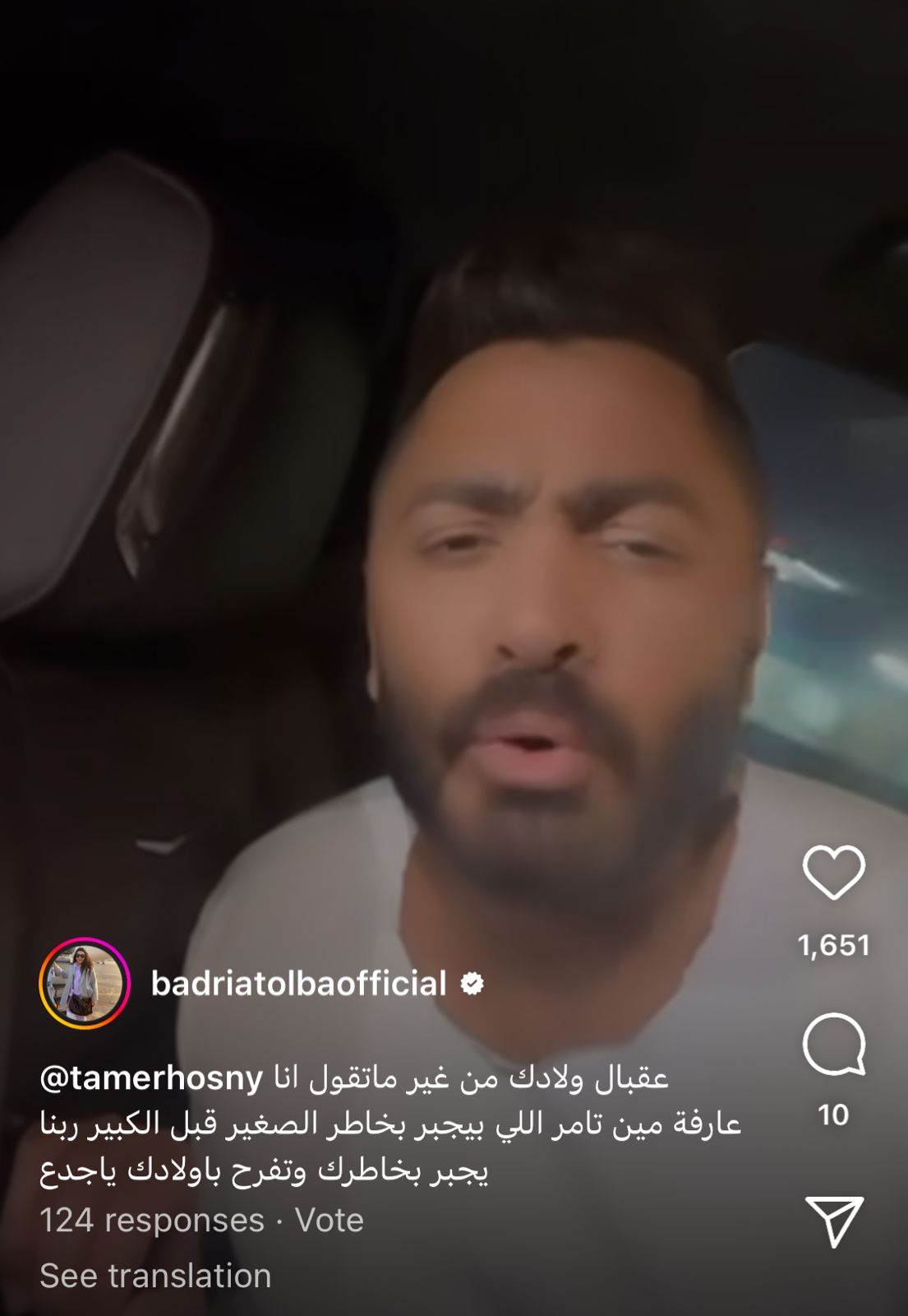 ونشرت بدرية طلبة عبر حسابها الرسمي بموقع تبادل الصور والفيديوهات انستجرام، فيديو ظهر من خلاله الفنان تامر حسني وهو يهنئ ويعتذر لها، قائلًا: مليون مبروك يا أجمل سلمى في الدنيا، باركي لعريسك الجميل.. ومليون مبروك يا بدرية كان نفسي أبقى معاكو بس أنا مسافر والله على الطريق أهو.