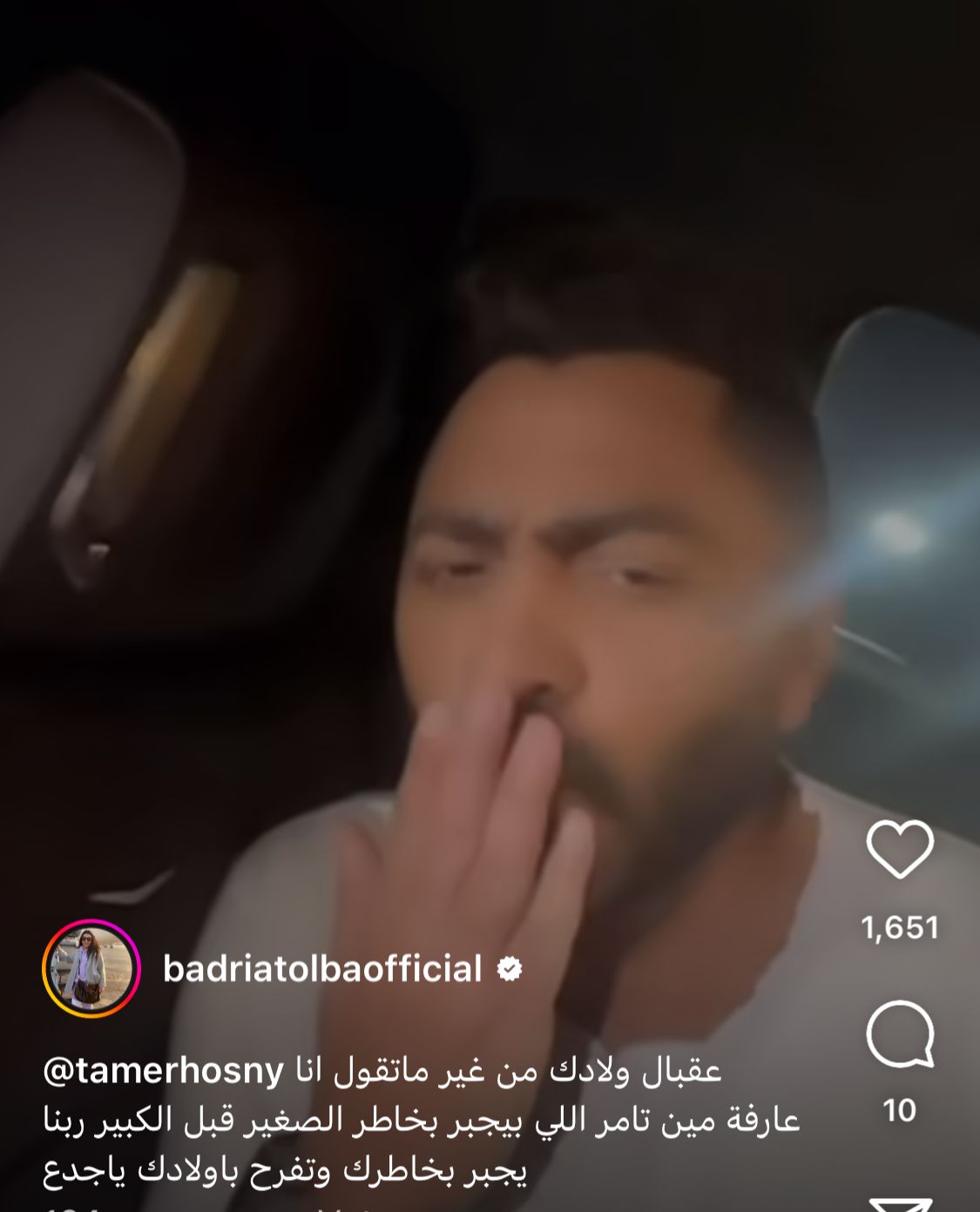 وردت عليه بدرية طلبة قائلة: عقبال أولادك، ومن غير ما تقول أنا عارفه مين تامر اللي بيجبر بخاطر الصغير قبل الكبير، ربنا يجبر بخاطرك وتفرح بأولادك يا جدع.