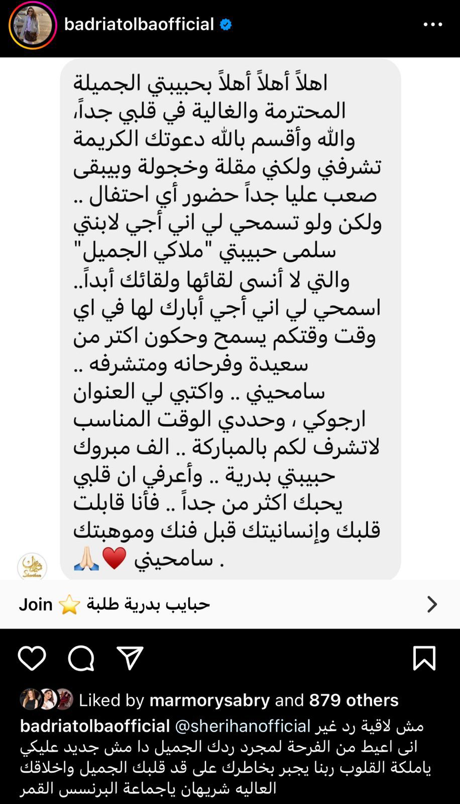 وأضافت شريهان: لكن ولو تسمحي لي إني آجي لابنتي سلمى حبيبتي ملاكي الجميل والتي لا أنسى لقاءها ولقاءك أبدًا... اسمحي لي إني أجي أبارك لها في أي وقت وقتكم يسمح وحكون أكثر من سعيدة وفرحانة ومتشرفة سامحيني.. واكتبي لي العنوان أرجوكي، وحددي الوقت المناسب لأتشرف لكم بالمباركة.. ألف مبروك حبيبتي بدرية.. واعرفي إن قلبي يحبك أكثر من جدًا.. فأنا قابلت قلبك وإنسانيتك قبل فنك وموهبتك.. سامحيني.