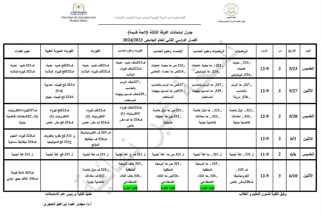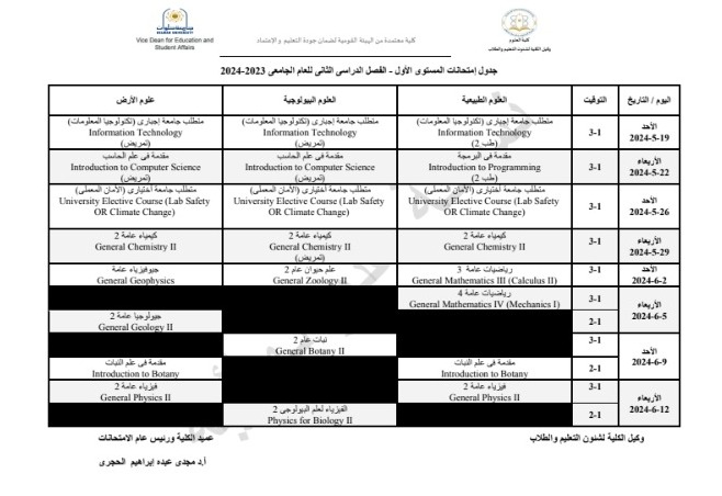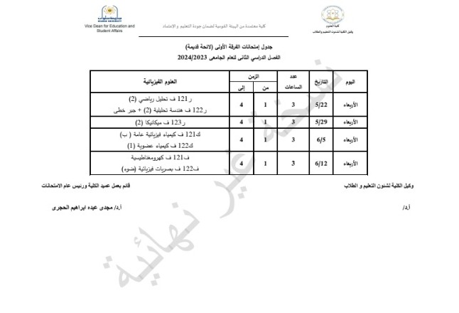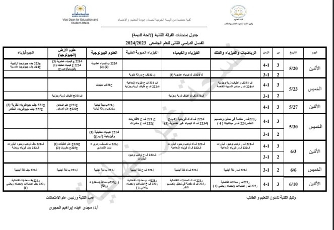 وكتبت كلية العلوم بـ جامعة حلوان عبر صفحتها الرسمية على فيسبوك، إن هذه الجداول ليست النهائية، ويجب على الطلاب مراجعة المواد في موعد أقصاه يوم الأحد 28 أبريل 2024 والرجوع إلى مكتب وكيل الكلية لشئون التعليم والطلاب في حدوث أي مشكلة.