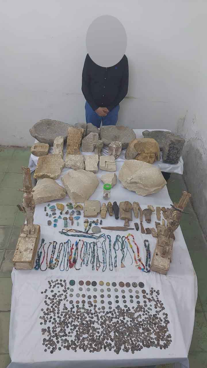 وعقب تقنين الإجراءات تنسيقًا ومديرية أمن أسيوط، أمكن ضبطه بمسكنه وعُثر بحوزته على عدد 1118 قطعة أثرية جاء أبرزها، مجسم لتابوت بداخله مومياء - عدد 2 تابوت خشبى بداخله مومياء عليه كتابات ونقوش فرعونية - تابوت على جزئين غير مكتمل من المرمر - عدد 2 تمثال خشبى عليهما نقوش ورسومات - عدد من الوحات الحجرية ولفائف الباردى والجعران والقلادات مختلفة الأحجام والأشكال – عدد من التماثيل وأجزاء تماثيل غير مكتملة متنوعة تعود لعصور قديمة – عدد من القطع الحجرية والخشبية وقطع من الزخرف والفيانس والفخار وأدوات منزلية تعود لعصور مختلفة – عدد من العملات المعدنية مختلفة الأشكال والأحجام تعود لعصور قديمة.