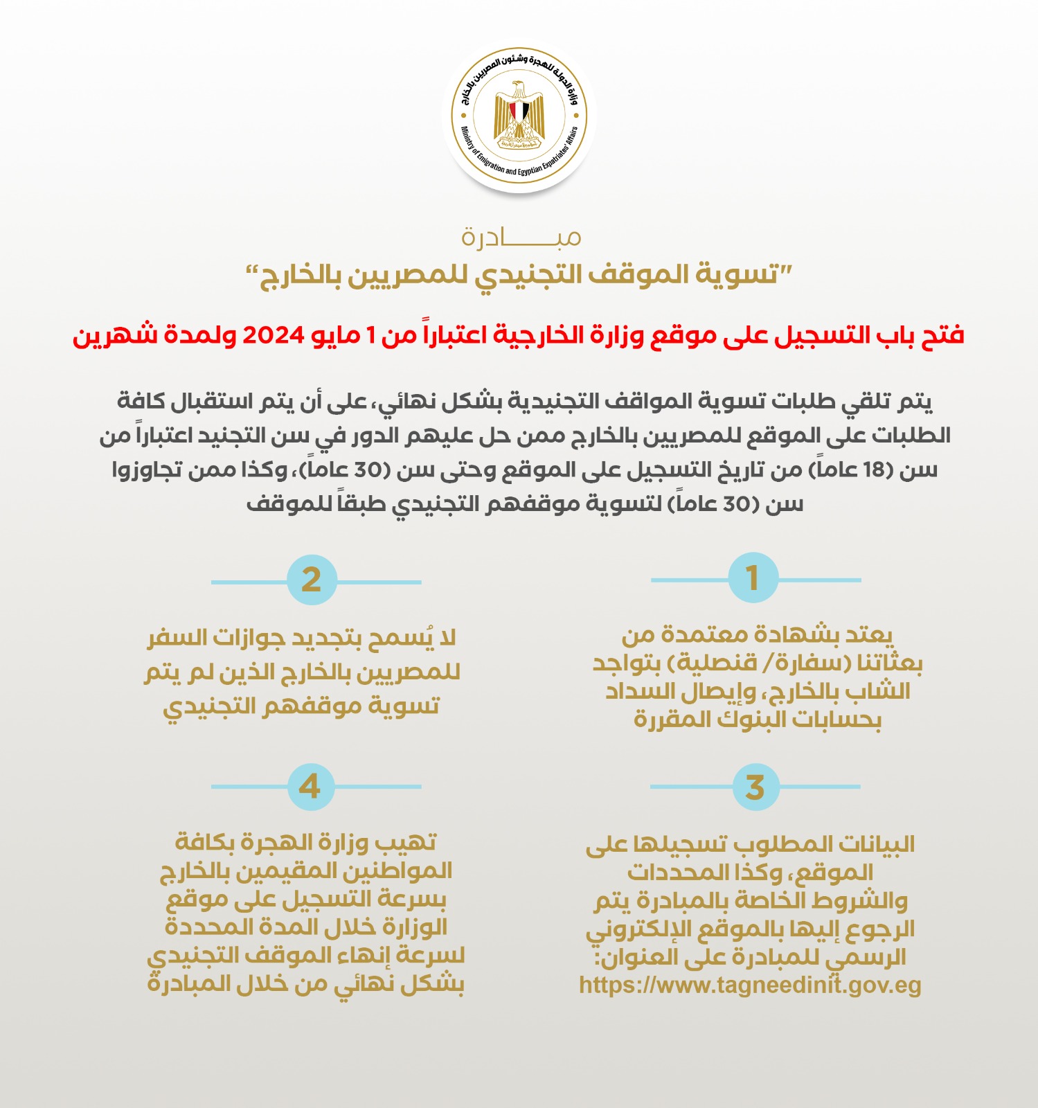 وتلقت وزارة الدولة للهجرة وشئون المصريين بالخارج، ووزارة الخارجية طلبات عديدة من المواطنين بالخارج حول إمكانية تسوية أوضاعهم التجنيدية، وحرصًا من الدولة المصرية على تقديم كافة التيسيرات لأبناء الوطن بالخارج، وتحقيق استقرار الحالة الاجتماعية لهم سواء (العمل- الدراسة- العلاج-...)، فقد تقرر الآتي: