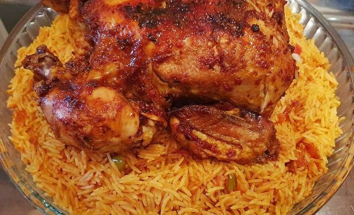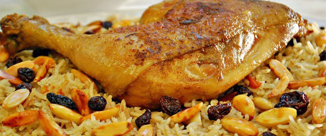 - يوضع الدجاج في الفرن حتى يأخذ لون أحمر ثم يوضع الأرز عليها وتزين باللوز