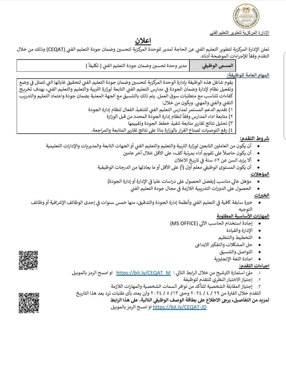 أعلنت الإدارة المركزية لتطوير التعليم الفني بـ وزارة التربية والتعليم، الحاجة لمدير للوحدة المركزية لتحسين وضمان جودة التعليم الفني (CEQAT)، موضحا المهام العام للوظيفة، حيث يقوم شاغل هذه الوظيفة بإدارة الوحدة المركزية لتحسين وضمان جودة التعليم الفني لتحقيق غاياتها التي تتمثل في وضع وتفعيل نظام لإدارة وضمان الجودة في مدارس التعليم الفني التابعة لوزارة التربية والتعليم والتعليم الفني بهدف تخريج كفاءات تتناسب مع متطلبات سوق العمل، حيث يتم ذلك بالتنسيق مع الجهة المعنية بضمان جودة واعتماد التعليم والتدريب التقني والفني والمهني.