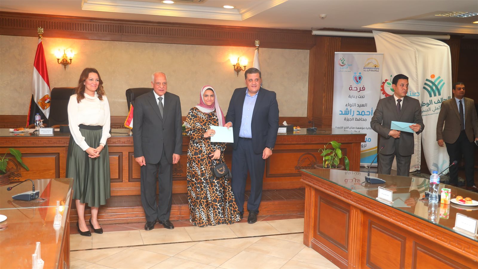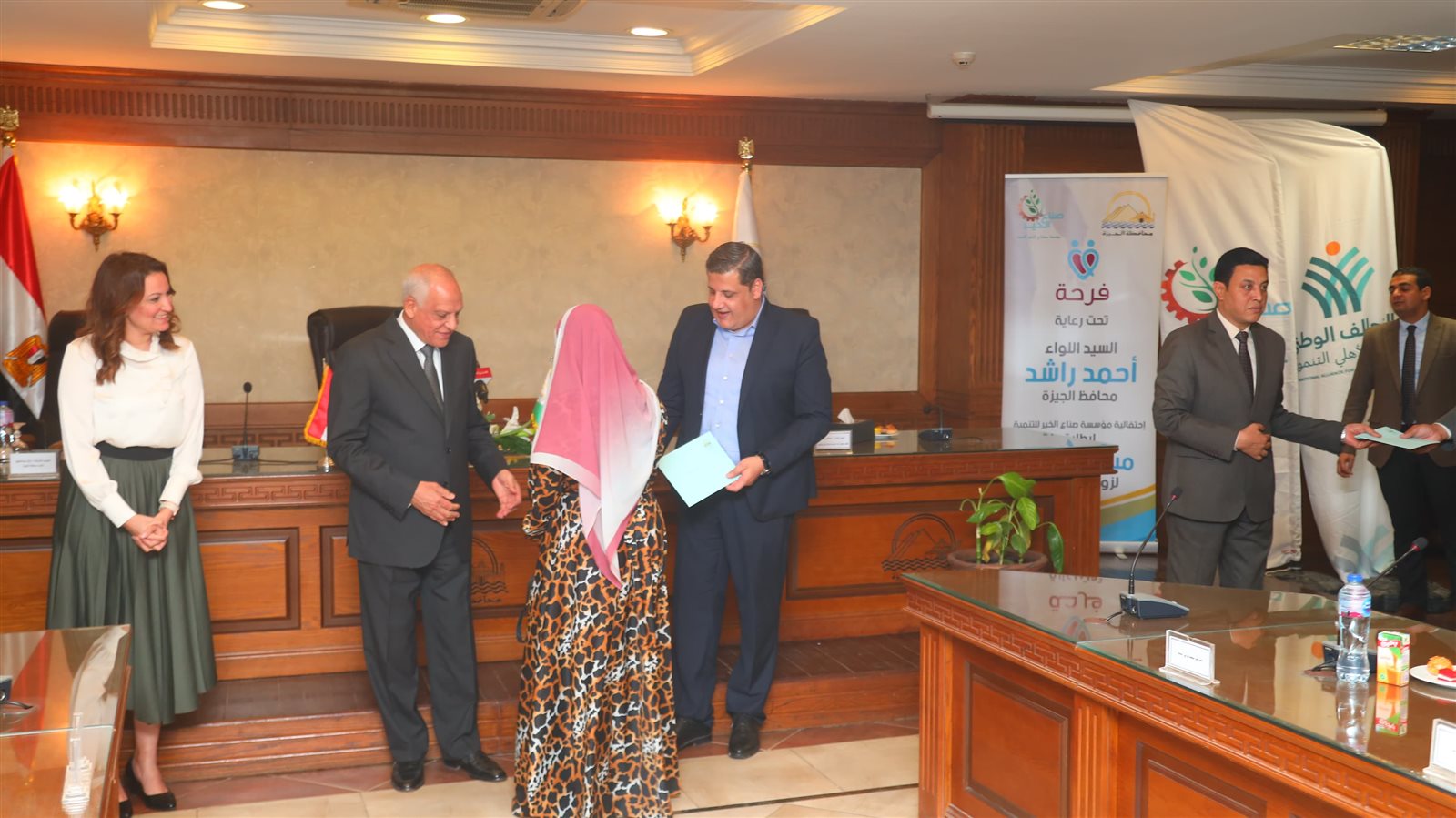 سلّم اللواء أحمد راشد محافظ الجيزة، ومصطفى زمزم، رئيس مجلس أمناء مؤسسة صناع الخير للتنمية، عضو التحالف الوطني سفير المبادرة الرئاسية حياة كريمة، 35 فتاة من اليتيمات وغير القادرات المقبلات على الزواج من مراكز محافظة الجيزة المختلفة منح مالية قيمتها 700 ألف جنيه بواقع 20 ألف لكل عروسة مقدمة من مؤسسة صناع الخير ضمن مبادرتها فرحة لدعم إتمام زواج الفتيات اليتيمات غير القادرات.