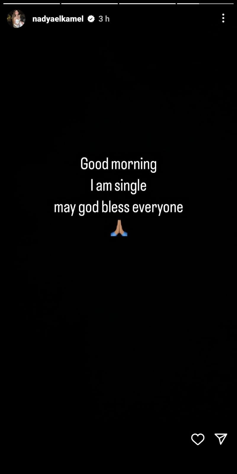وكتب طليق ندى الكامل، تعليقًا، عبر ستوري خاصة على حسابه الشخصي بموقع تبادل الصور والفيديوهات القصيرة إنستجرام، قال فيه: قل لن يصيبنا إلا ما كتب الله لنا، تم الانفصال بيني وبين زوجتي، وأرجو احترام الخصوصية، وعدم الدخول في تفاصيل، مرت سنة على هذا الزواج ولكن كل شيء قسمة ونصيب.. الحمد لله، بينما أعلنت ندى الكامل طلاقها عبر ستوري آخرى، قالت فيها: أنا سينجل.